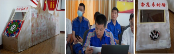 西柏坡精神是部生動的教科書,車間工人黨員袁有德利用平時(shí)裝配件的紙盒子,創(chuàng)意性地制做了一列"團(tuán)結(jié)奮進(jìn)號"火車,邀請黨員一起乘車前行。袁有德說:"團(tuán)結(jié)奮進(jìn)號"列車蘊(yùn)含著學(xué)習(xí)西柏坡精神,強(qiáng)企富家、團(tuán)結(jié)奮進(jìn)的寓意,車頭前面的"大眾"標(biāo)識代表公司經(jīng)營的品牌;八個綠色的大美孚機(jī)油蓋代表八方來財(cái),所有蓋口都向外代表招攬客戶,減少流失,而且像螺絲釘一樣牢牢釘?。≤囶^車尾標(biāo)有"勿忘來時(shí)路"的字樣,以此提醒廣大黨員干部不忘初心、牢記使命,一定不要忘記來時(shí)的路,回顧過去,展望未來,讓"團(tuán)結(jié)奮進(jìn)"號列車在西柏坡精神的感召下前行。支部要求,在疫情防控和汽車行車嚴(yán)竣的形勢下,我們每一個物產(chǎn)汽貿(mào)員工都是新時(shí)代的答卷者,讓"團(tuán)結(jié)奮進(jìn)號"奔馳在新時(shí)代的征程上,承載著中國夢、物產(chǎn)夢,承載著物產(chǎn)汽貿(mào)職工群眾對美好生活的向往,風(fēng)馳電掣,勇往直前,奔向未來!