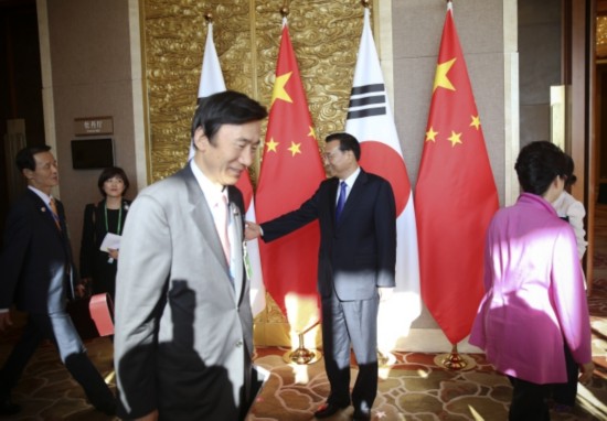 李克強(qiáng)總理會見韓國總統(tǒng)樸槿惠時對方提出,韓方愿同中方等各方加強(qiáng)溝通協(xié)調(diào),爭取新一輪韓中日領(lǐng)導(dǎo)人會議早日舉行。李克強(qiáng)說:"希望在重大問題上,日方能與中方、韓方相向而行。"