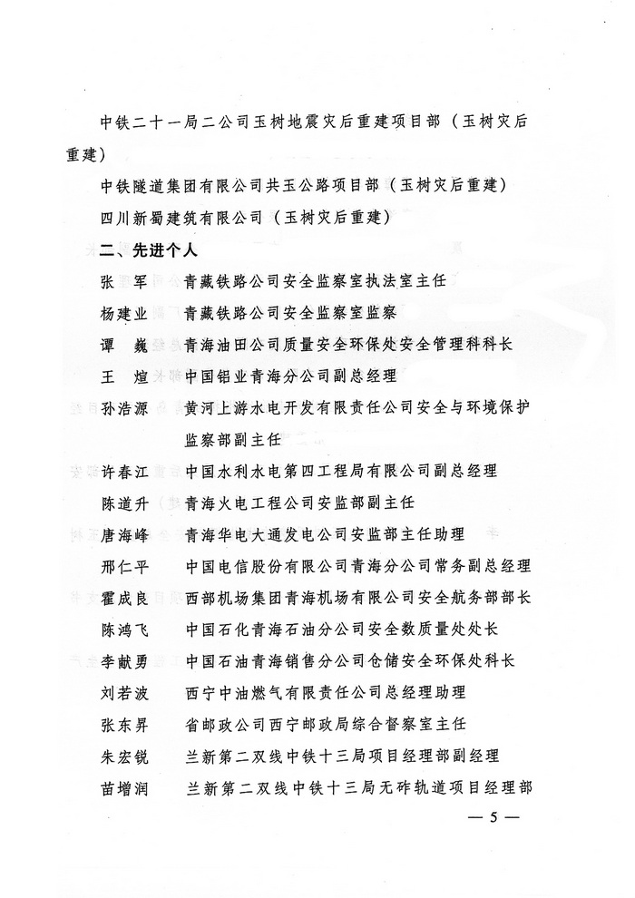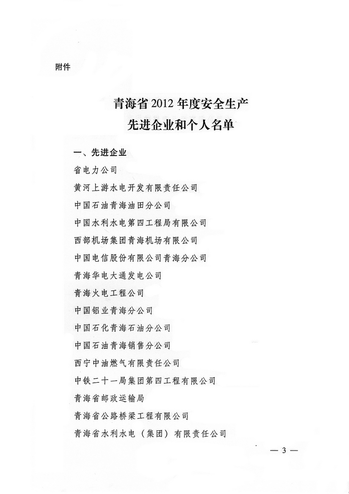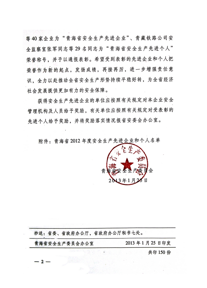 2012年,在省委、省政府的正確領(lǐng)導(dǎo)下,青海省物產(chǎn)集團(tuán)總公司認(rèn)真學(xué)習(xí)貫徹黨的十八大精神,全面貫徹落實(shí)科學(xué)發(fā)展觀,牢固樹立以人為本、安全發(fā)展的理念,深入開展"安全生產(chǎn)年"、"隱患排查治理"、"打非治違"等活動,為促進(jìn)全省安全生產(chǎn)形勢持續(xù)穩(wěn)定好轉(zhuǎn)做出了積極貢獻(xiàn)。為此,經(jīng)省政府同意,省安全生產(chǎn)委員會決定授予青海省物產(chǎn)集團(tuán)總公司"2012年度安全生產(chǎn)先進(jìn)企業(yè)"榮譽(yù)稱號。
